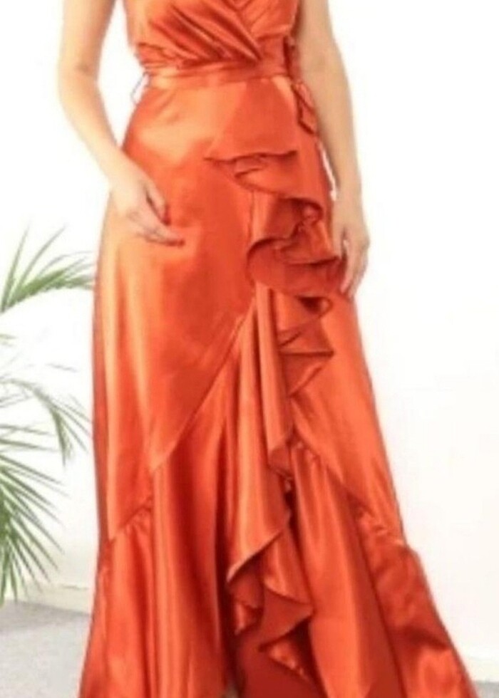 Uzun etek kısmı fır fır detaylı ve yaka sırt bağlamalı s beden ama m- l bedene uygundur bağlama dateyli olduğu için.Kumasi satendir kiremit rengidir.