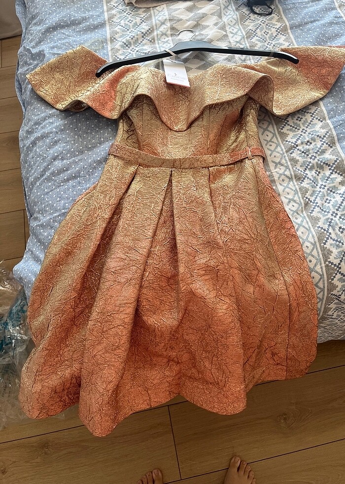Arkadaşımın düğünü için almıştım giymeye fırsatım olmadı ürün hiç kullanılmadı etiketi üstünde hasarı kusuru deformitesi yok nar çiçeği renginde simli gibi görünen bir kumaşı var kayık yaka bir elbise