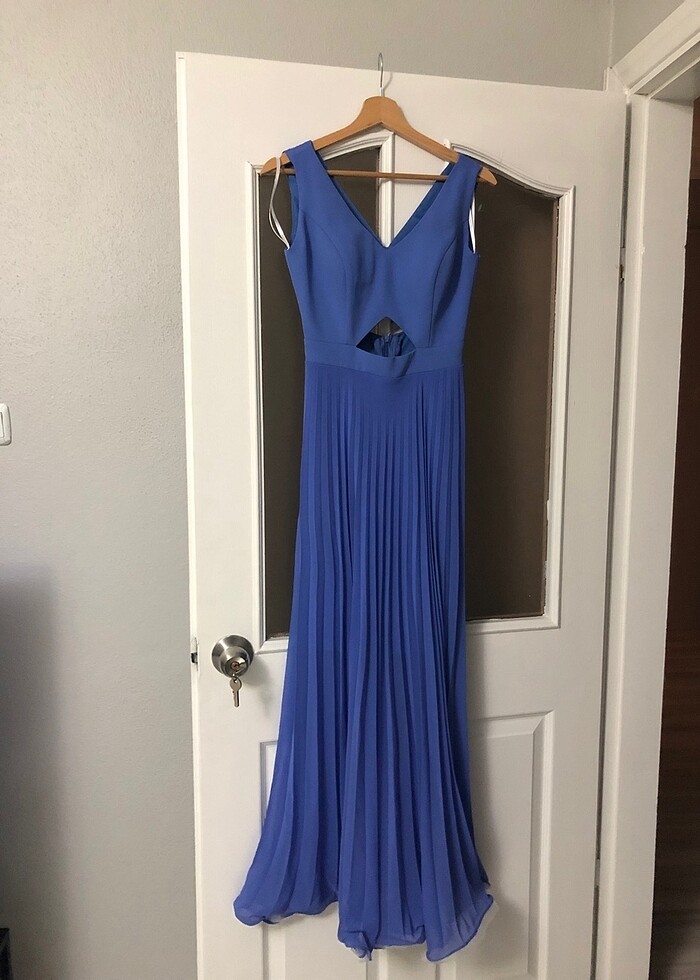 Doridorca marka abiye elbiye. 160 boya uygun. Elbisede beyaz nokta olan yer fondöten lekesi olan yer. Mor ve mavi arası bir renk.