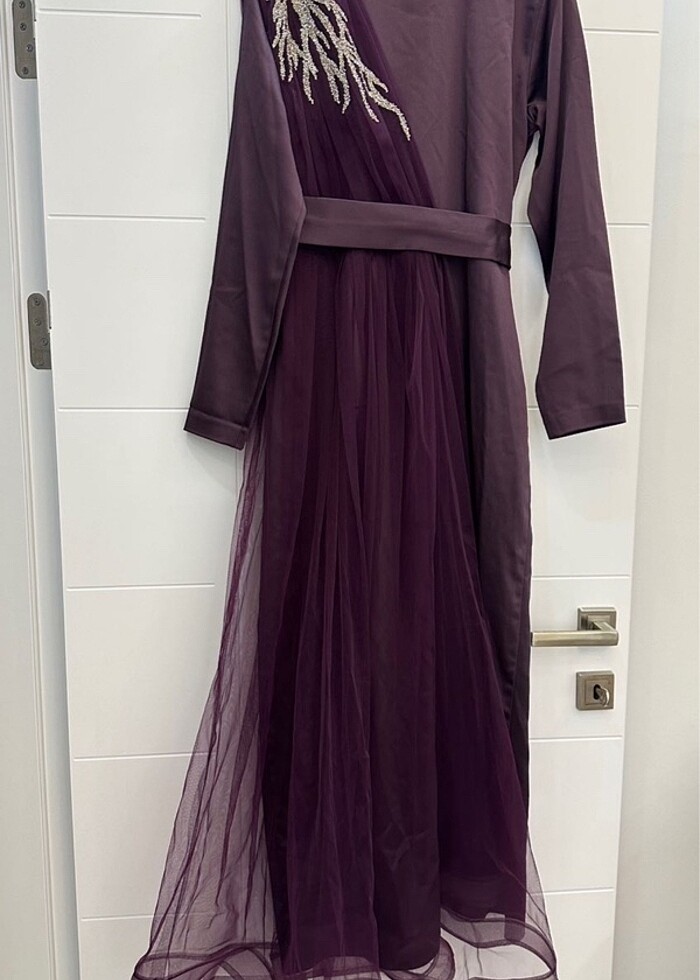 Abiye elbise saten kumaştır hafif esner üzeri hayal tül 2 defa giyildi özel dikim olarak tasarlandı göğüs 95 cm bel 82 cm basen 105 cm dir 38-42 beden arası