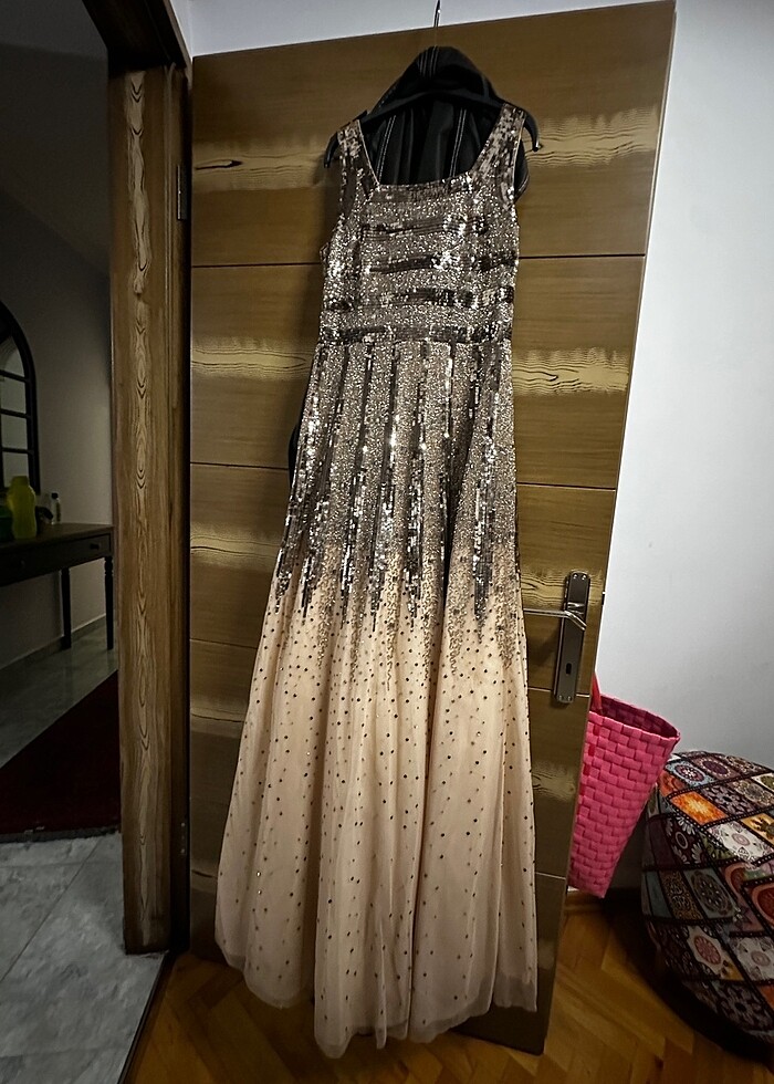 Vakko marka, uzun, kendinden etek uçlarına doğru renk geçişli, pullu payetli 36 beden abiye elbise. (38 bedenede olabilir)