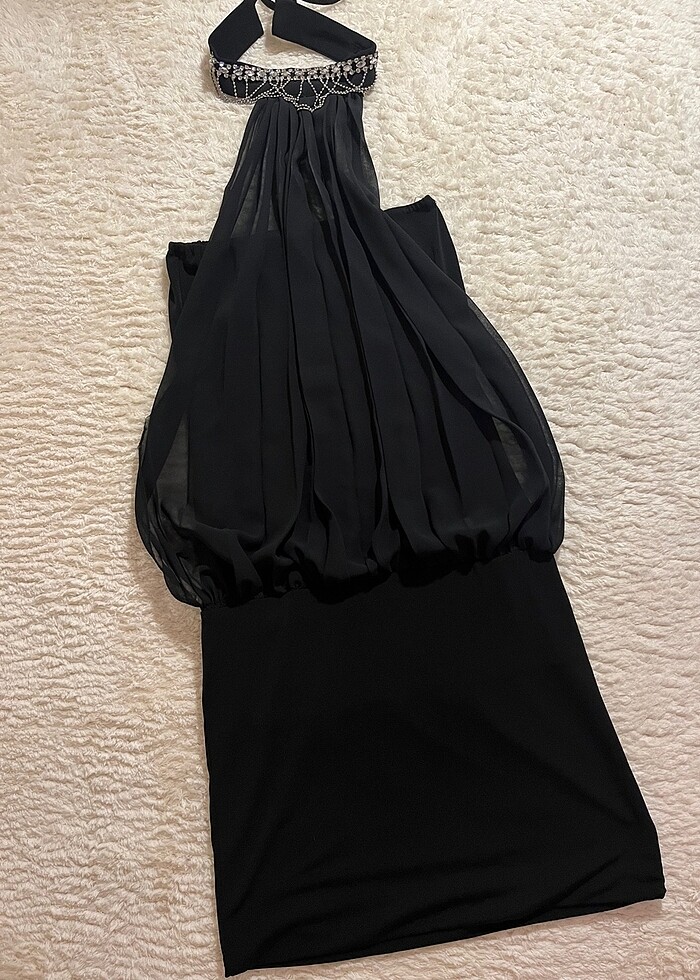 Boyundan bağlamalı taş aksesuarlı mini abiye elbise