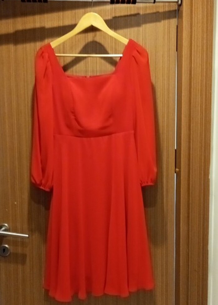 38/40 bedene uygun, önü de arkası da kare şekilde gelen, tül, ince gögüs desteği olan, boyu omuzdan 103 cm, midi boy, kırmızı abiye... Sadece bir kere giyildi, yepyenidir