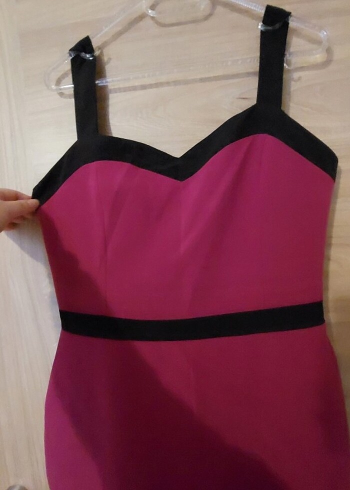 Fusya rengi siyah şeritli balik model uzun abiye