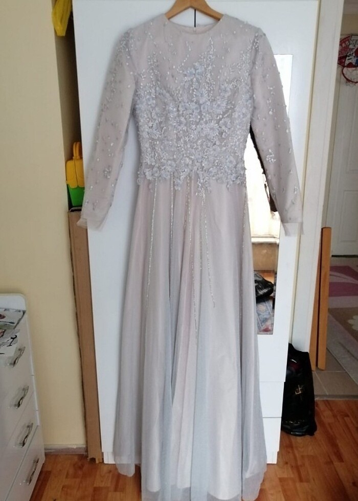 38 beden sıfır terzi dikim elbise. İçi pudra rengi astarlı, tülden kaynaklı rengi fotoğraftaki gibi gri - mavi tonunda. Aşağı doğru bollaşan çan modeli var, hiç giyilmedi. Boyu orijinal halinde terzi dikimi uzun model elbise. Fotoğrafları inceleyebilirsiniz. Fiyatta yardımcı olunur #elbise #abiye #nişan #söz #nişanlık