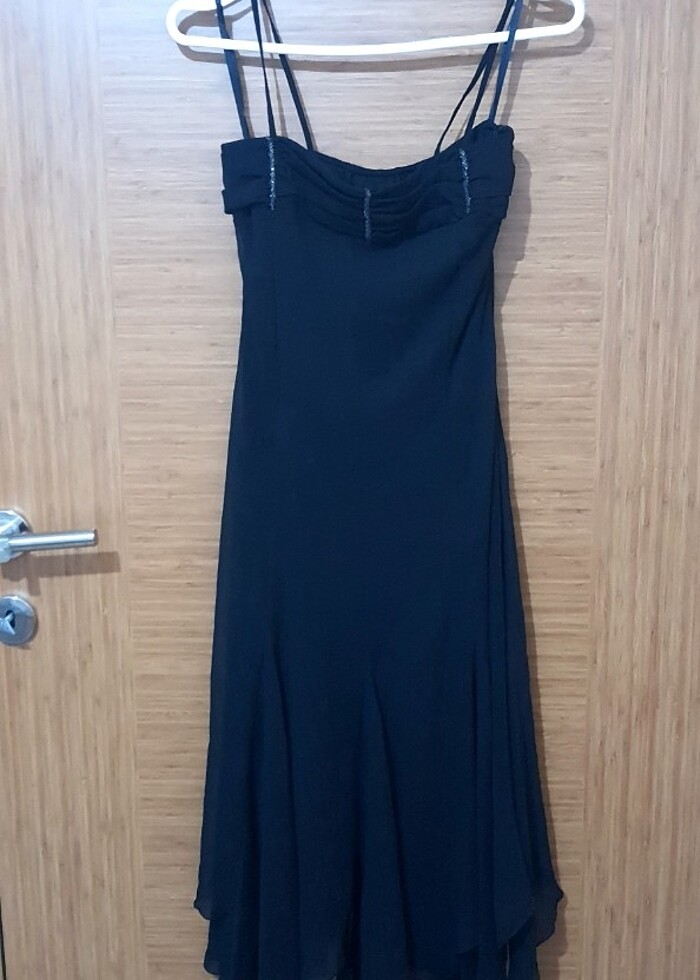 Rengi simsiyahtir.36 bedene tam uyumludur.bikere giyilmistir ve tertemizdir.etek uclari asimetrik kesimdir.mezuniyet balosu kl dugun hepsine uygun cok sık bir elbisedir
