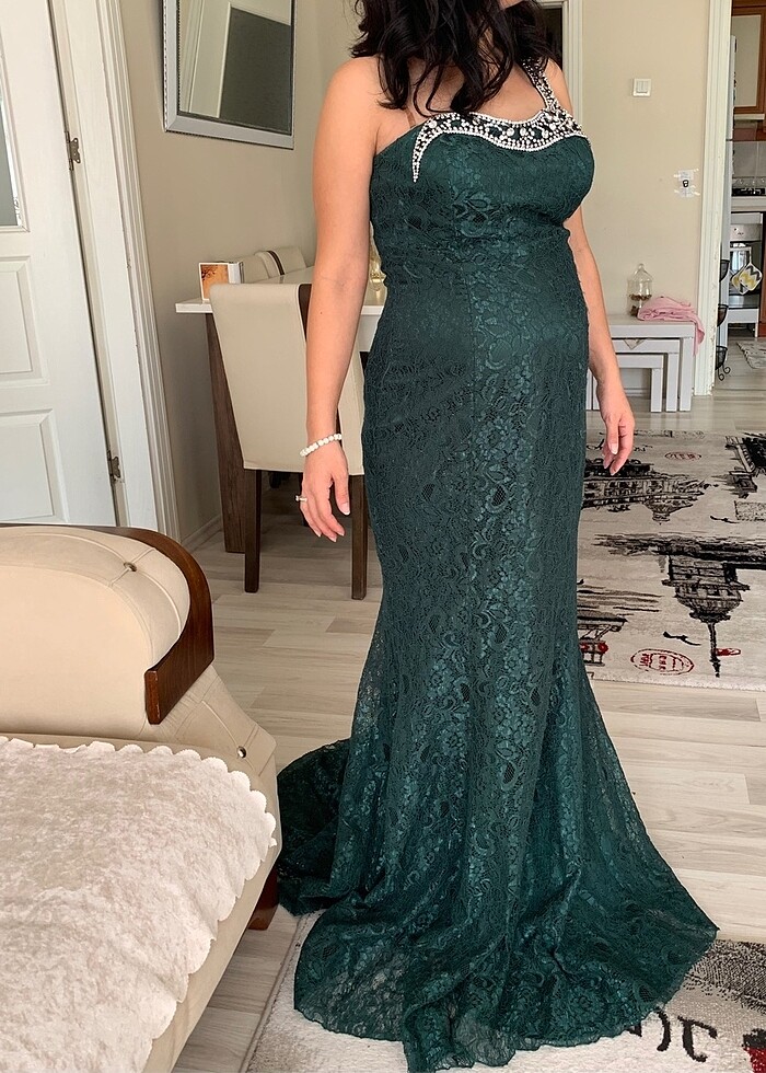 Etiketi üzerinde taşlı yeşil abiye elbise