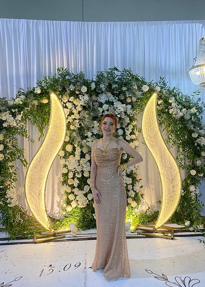 Alfabeta muadilidir!! Arkası fermuarlı 1 kere kuzenimin düğünü için giydim. Ürün defosu yok. Sonradan ip askı yaptırdım dileyen çıkarttırabilir. Rengi daha çok soman gibi çok pembe değil. 1.60 boyunda 45 kiloyum 10 cm topuklu ayakkabıyla giydim. Tekliflere açığım