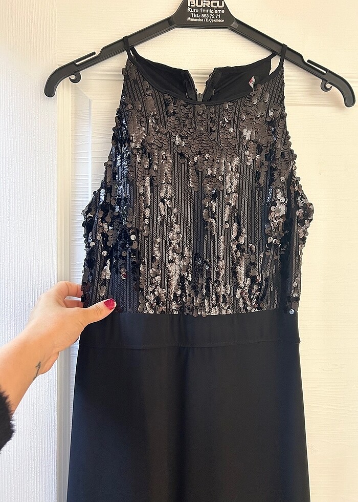 Üst kısmı payet altı şifon içi astarlı yandan yırtmacı var dize kadar sıfır