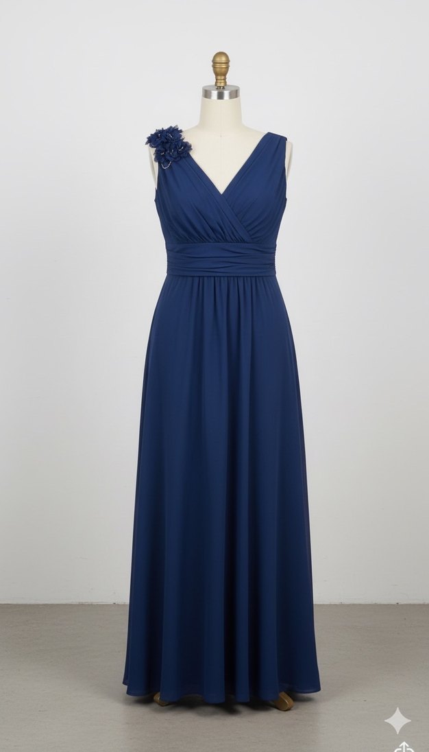 Sıfır kollu, drapeli, v yaka ve sırt. Sağ omuzdan sırta uzanan çiçek ve taş görseli. Parlament mavisi renginde, uzun balık abiye elbise modeli. 1 kez düğünde giyilmiştir. Kılıfıyla gönderilecektir.