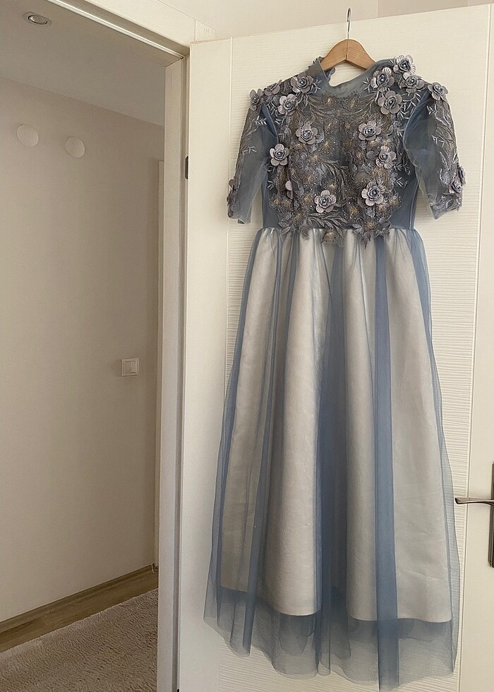 Tam bir prenses model bilekte üç boyutlu çiçek desenli kendinden sütyenli sırt dekolteli isteyen yedek aparatını da kullanabilir bebe mavi gri tonlarında elbise altı kırık beyaz ve bebe mavi tül şeklindedir. 36 beden için uygun olup tasarım bir elbisedir