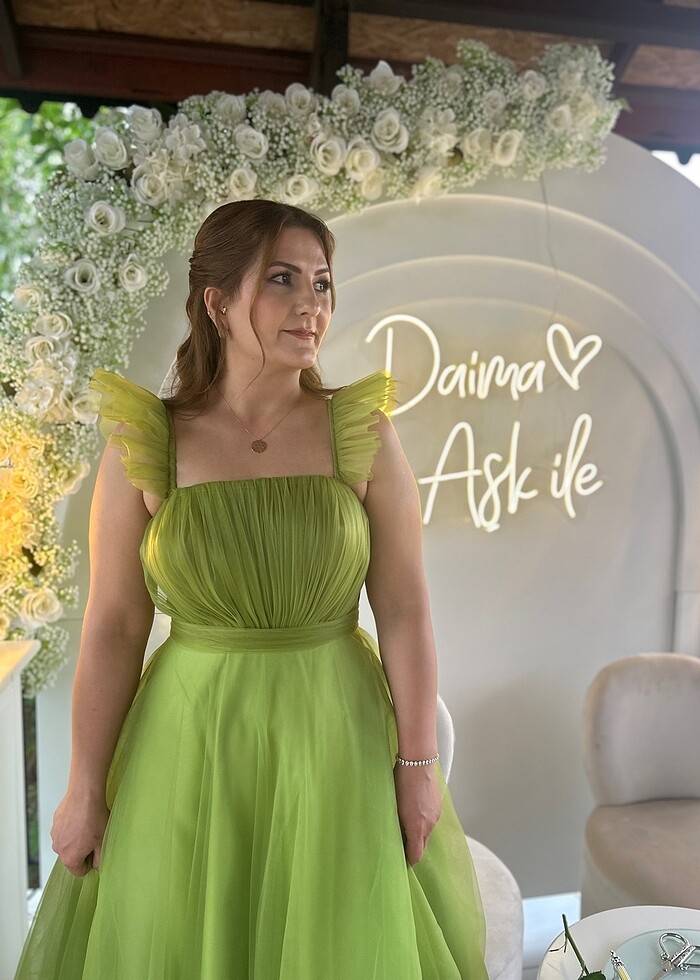 Yağ yeşili tüllü elbise. Sadece bir kez giyildi. 40-42 beden uyumludur. Özel dikimdir. Önden arkadan duruşu görseldedir. Hiçbir deformesi yoktur.