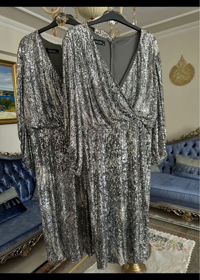 Tamamı pul elbise. Antrasit renk. Diz altı boy. Astarı ve kendi kumaşı likralı. Bilekleri lastikli