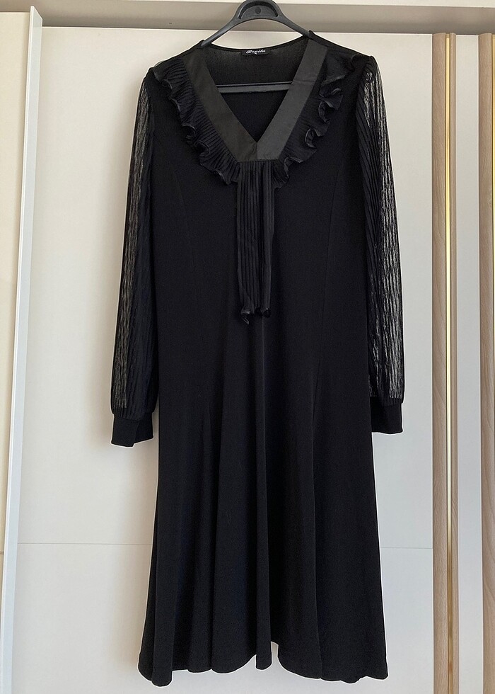 Yaka kısmı saten detaylı ve fırfırlı , kolları tamamen tül , etek kısmı kiloş, oldukça hafif bir elbisedir. Tam anne elbisesidir.