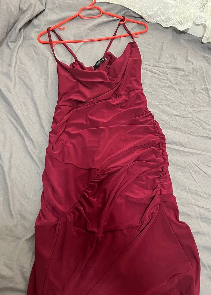 Yırtmaçlı bordo abiye elbise. Bir kez giyildi. Üstte duruşu harika