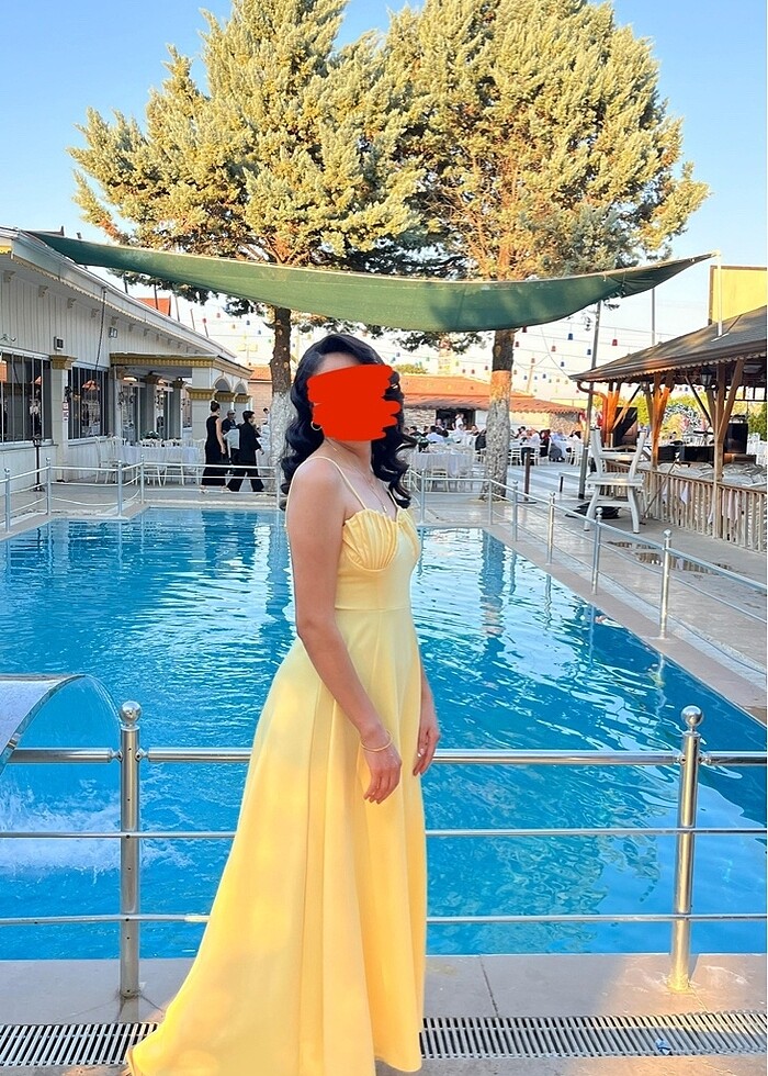 Sarı ince askılı drapeli uzun abiye elbise