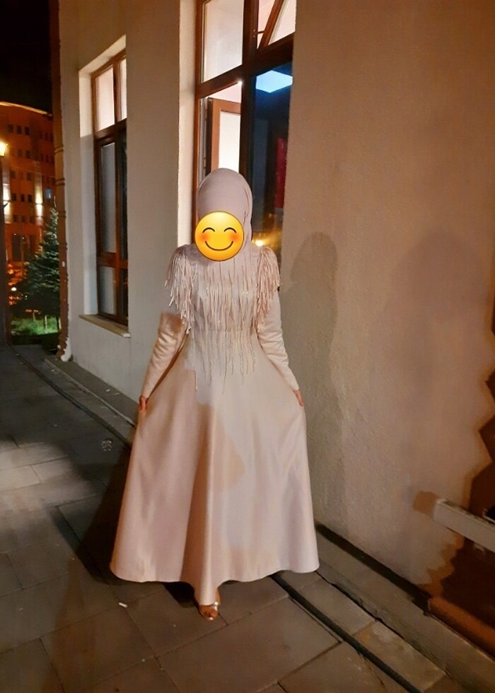 36 beden saten pudra pembesi iç göstermez 2 saatliğine düğün için giyinildi eşarp içinde