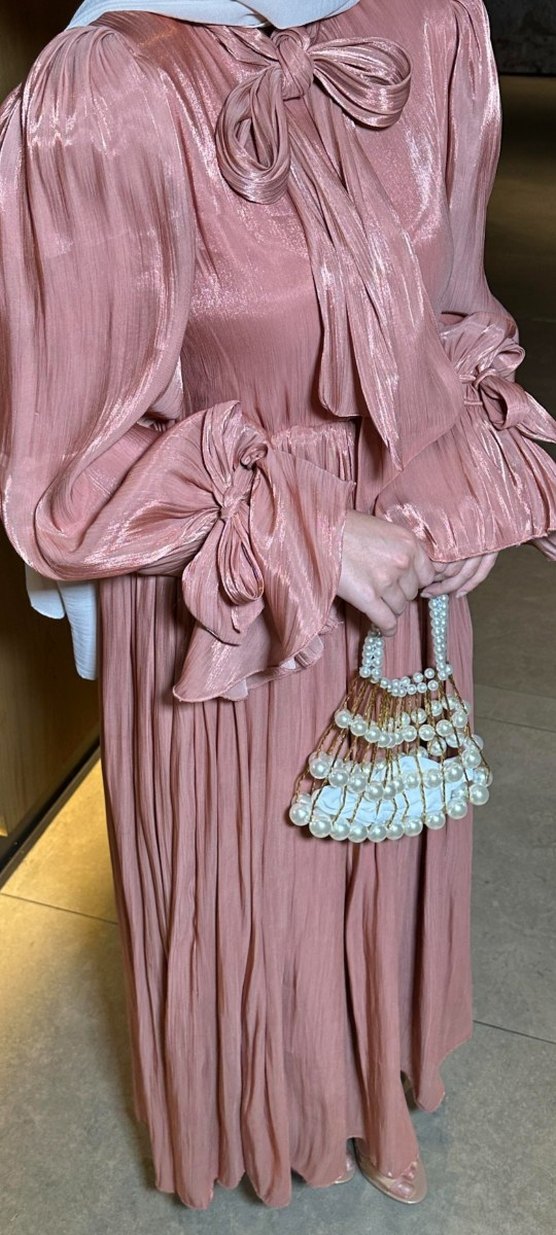 Pembe parlak kumaştan, piliseli ve bilekleri bağcıklı askılı uzun, bol kesim bohem elbise. Nakışlı deseni ve halter yakası ile düğünler için uygun. beden sorunuz, renkleri ve bedenleri mevcut