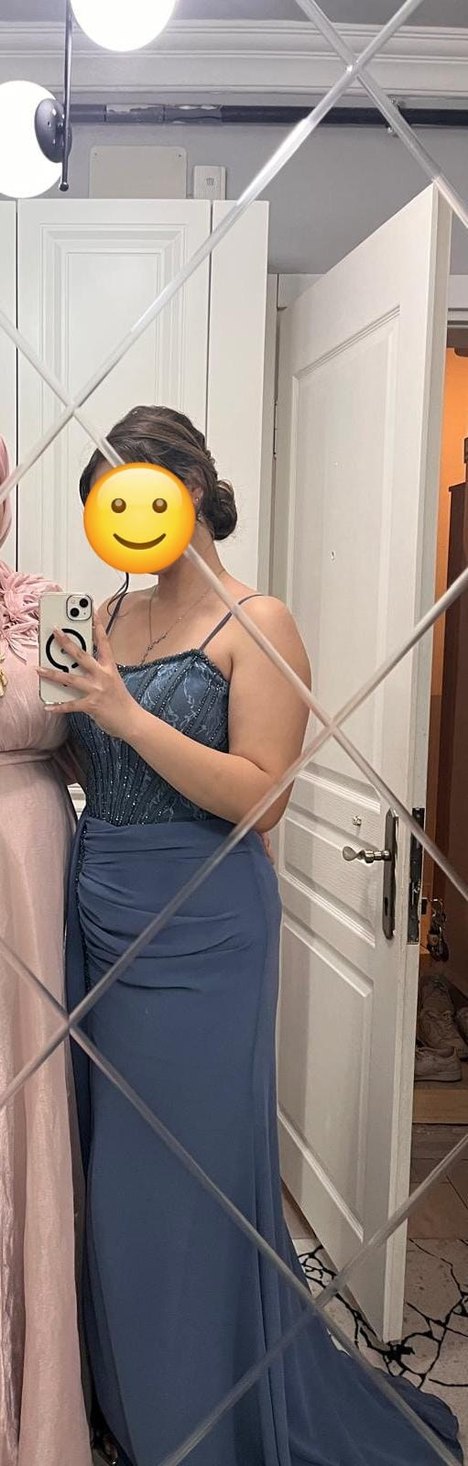Mavi straplez, ince askılı, yan yırtmaçlı ve bağlama desenli, dar kesim midi abiye elbisedir. Cesur parti kombinleri için uygundur.