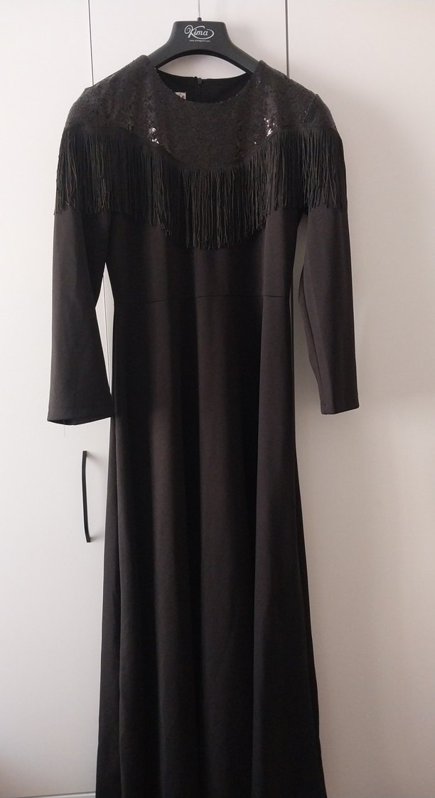 Siyah, uzun kollu, yüksek yakalı, nakışlı ve püsküllü detaylara sahip, vücuda oturan uzun elbisedir. günlük kullanıma uygun değil 42 beden. ancak dar kalıp.