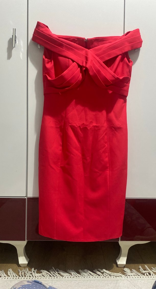 Kırmızı kayık yaka, astarlı vücuda oturan abiye elbise. 1 kere giyildi hiçbir lekesi vs yok