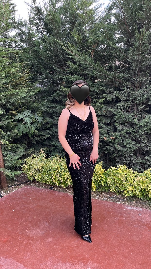 Siyah, v yakalı, askılı pulpayet abiye hiç bir sıkıntısı yoktur 40 bedenede uyumludur ligralıdır
