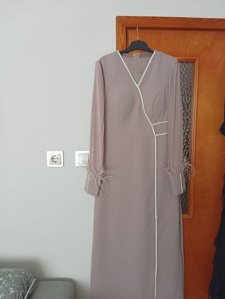 Uzun kollu, regular kesim, minimalist bej renkte kadın elbisesi. Modern klasik tarzda, kollarında tüy detayları ve önünde beyaz şeritler bulunur. ✨ 40/42 bedene uyumludur Saatlik düğünde giyildi giyildiğinde zarif duran modeldir.