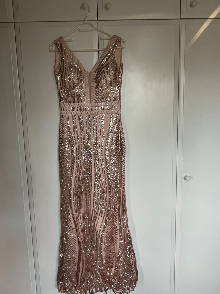 Pudra rengi, V yaka, kolsuz, payet işlemeli uzun abiye elbise, sırtı fermuarlı, astarlı, klasik ve modern şıklık sunar. ✨