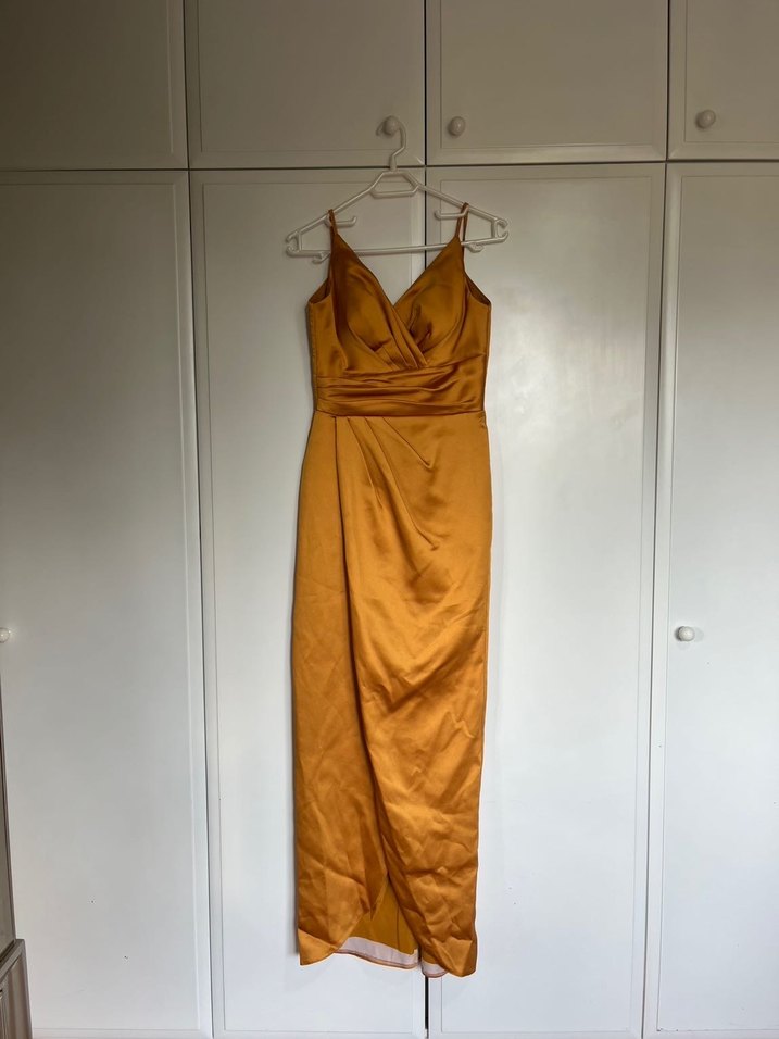 Hardal renk, saten kumaş, astarlı, drapeli ve V yakalı uzun abiye elbise. İnce askılı kruvaze model ve vücuda oturan kesimiyle düğün ve özel günler için uygundur. Modern klasik tarzda vintage dokunuş içerir.