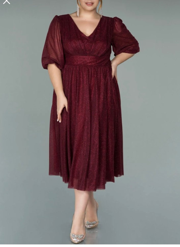 Bordo midi abiye elbise, V yakalı, bol kesim ve drapeli tasarıma sahip. Bir kere giyildi 44 beden
