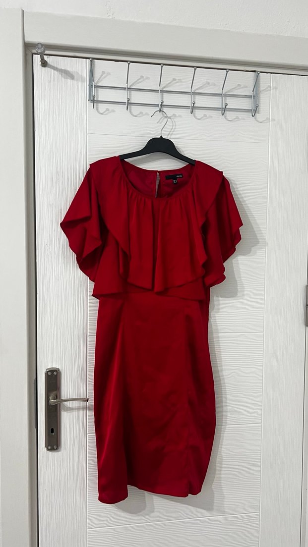 Drapeli tasarıma sahip, kısa kollu ve V yakalı kırmızı, vücuda oturan midi uzunlukta abiye elbisedir. Parlak kumaşı ve modern klasik tarzı ile romantik akşamlar için uygundur.