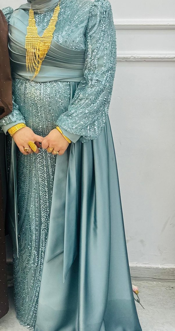 Bu dar kesim abiye elbise uzun kollu, straplez yakalı, işlemeli desenlere ve drapeli detaylara sahiptir. Turkuaz ve gri tonlarıyla şık bir görünüm sunar. 1 kere kapalı ortamda giyildi yeni gibi