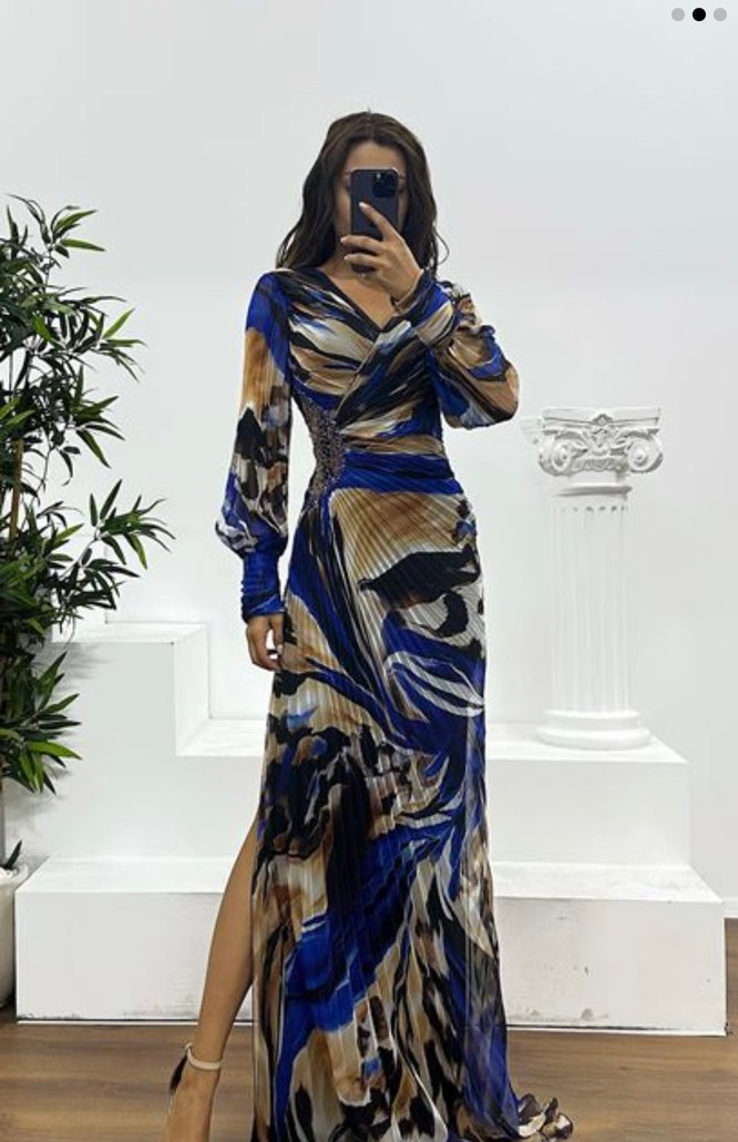 V yaka ve uzun kollu, pilili detaylara sahip, koyu mavi bağlama desenli, fit kesim uzun gece elbisesi. Sıfır