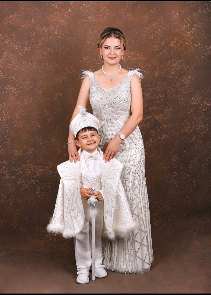 Ürün oğlumun sünneti için bir kez giyilmiştir, komple şimdi ve taş detaylıdır omuzlarında tüy detayları mevcuttur iç göstermez nikah için uygundur sünnet annesi için uygundur zarif ve gösterişli bir elbisedir
