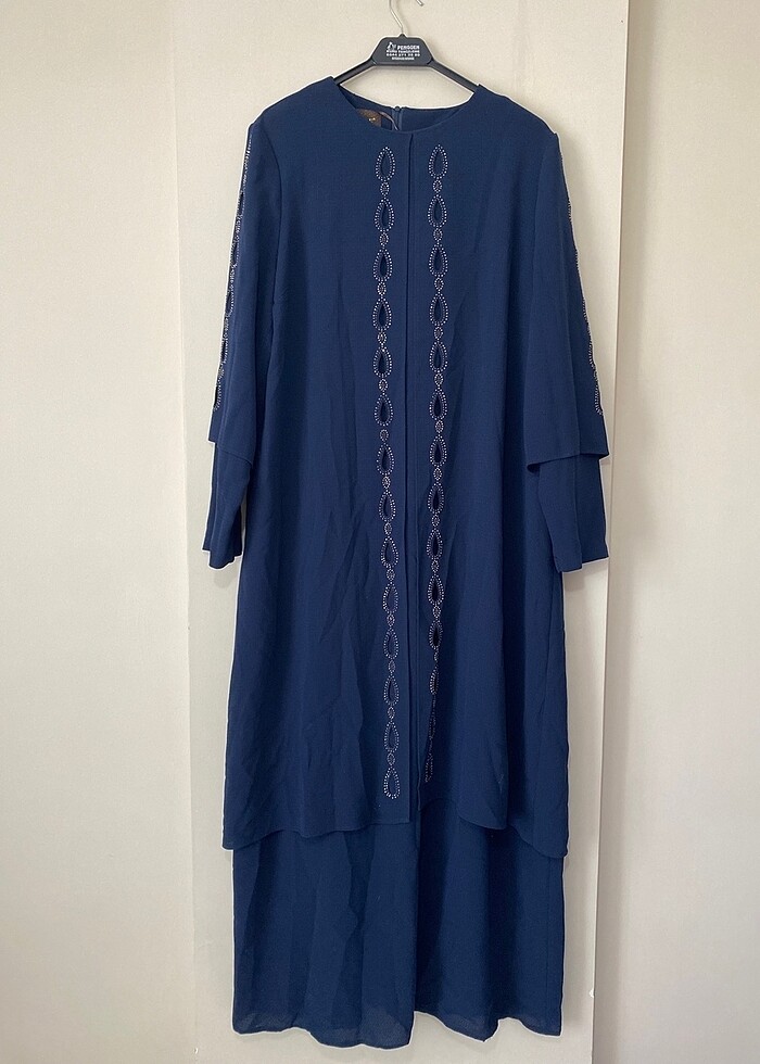 Bir kez giyildi. Anne işi abiye. İç elbisesiyle birleşik. Hiçbir kusuru tadilatı yok. 50 bedendir. 90kg’de giyilmiştir. Rengi lacivert. Göğüsten 60cmdir. Boyu 140cm.
