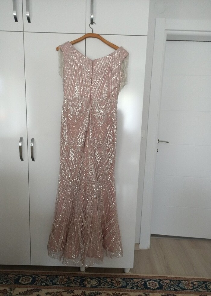 Ürün bir gece giyildi hiçbir sorun yok 42 bedene uygun hafif kuyruklu. Kollar boncuklu. İş