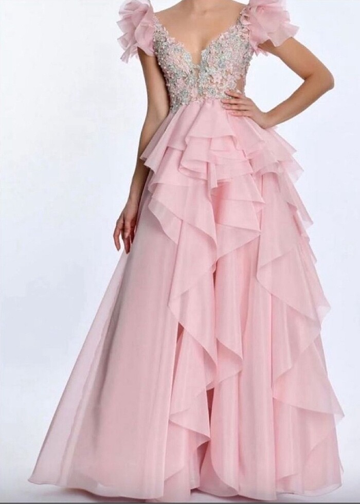 Çok gik özel bir tasarim, 3 saatligine giyilmistir,yeni temiz defosuz bir üründür pudra rengi tas islemeli bir abiyedir.Alfa Beta ürünüdür sadece ön ve yan kisimlardaki dekolteye kendi dantelinden içi ten rengi tülle ek yapilmistir daha rahat hareket edebilmek adina.Arzuya gore ek yerleri çikartilabilir inceleyerek bakabilirsiniz hassas bir üründür iadesi yoktur.L bedendir