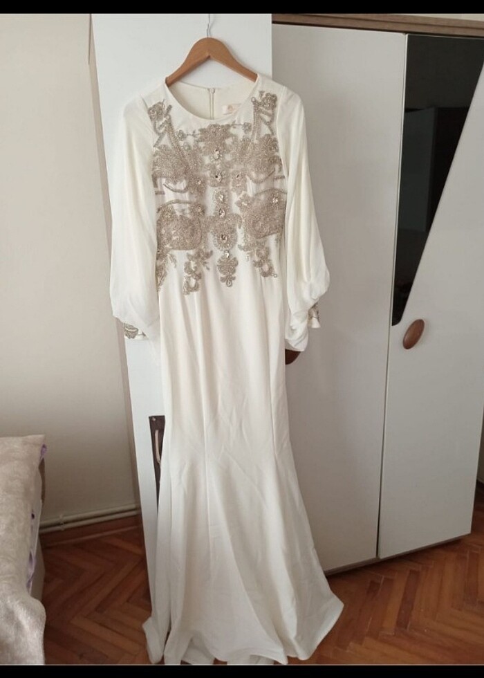 Nikah için almıştım cenaze sebebiyle iptal oldu giyemedim alındığı gibi duruyor Fatih Arya mağazasından alındı bilen bilir.Çok şık bir abiye fotoğrafta göründüğünden çok daha güzel kırık beyaz balık model, şifon şal da mevcuttur kapalı hanımlar için, arkası bir tık daha uzun tavsiye ederim ilgilenenlere.