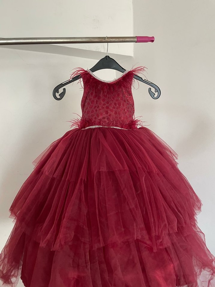 4-5-6 yaşa uygun,bordo renk,kabarık tüllü ,yaka detayları parıltılı ve tüy süslü, kalın askılı, arkada büyük fiyonk ( istenirse çıkarılabiliyor ) detaylı ,kabarıklık veren tarlatan ve saten astar iç kısımda mevcut. Düğün,nişan ve doğum günü gibi kutlamalarda kızınızın prenses gibi gösterecek minik abiye elbise. Temiz,yıpranmamış, hasarsız abiye. Ölçüleri: Omuzdan bele kadar 26 cm.İki koltuk altı en 32 cm.Kol altından bele kadar 12 cm. Tüm bel çevresi 75 cm. Belden etek ucuna kadar ki boy 60 cm. Kurdale boyutu 25×16 cm.