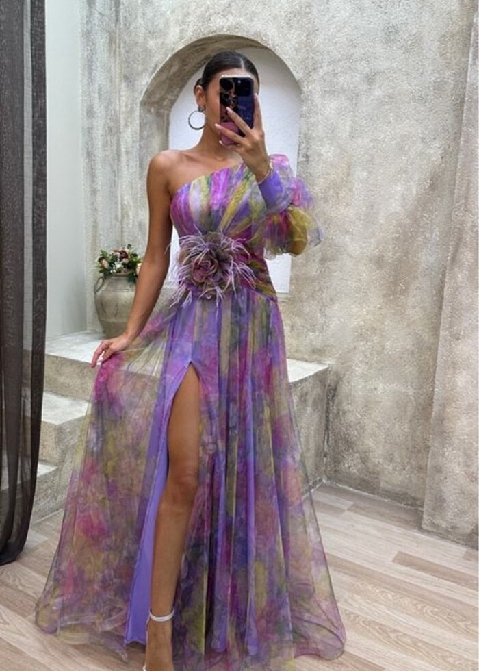 Tek kol beli gül detay tüylü tül abiye elbise