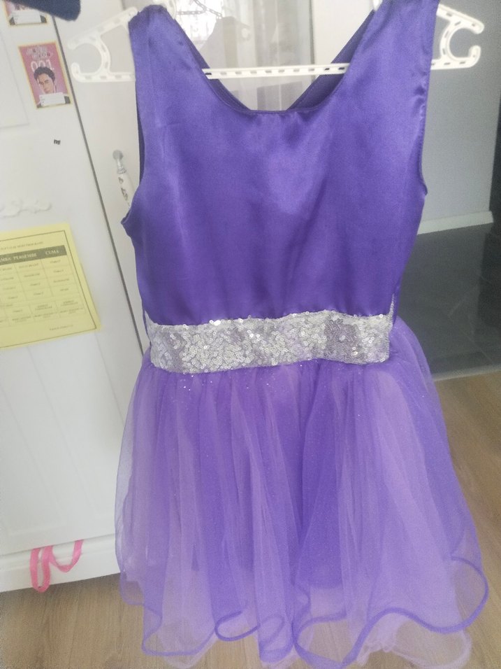 Parlak mor sentetik kumaştan, kolsuz ve V yakalı, oturan kesim kız çocuk elbisesi. Fırfırlı detaylı ve payetli kemer içerir.