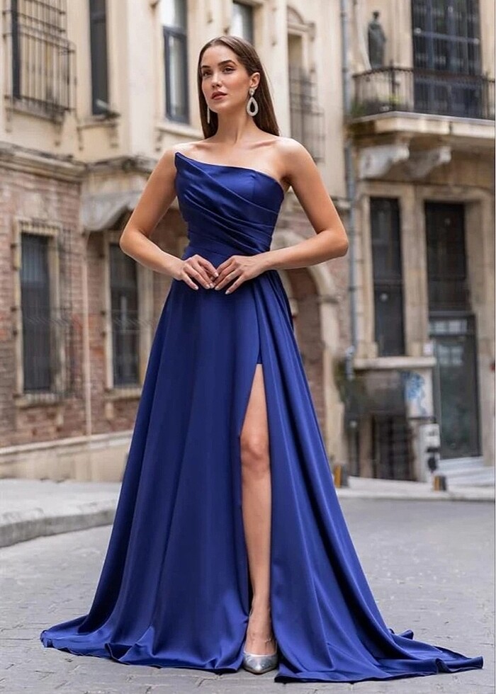 Abiye lacivert yırtmaçlı sıtraplez elbise