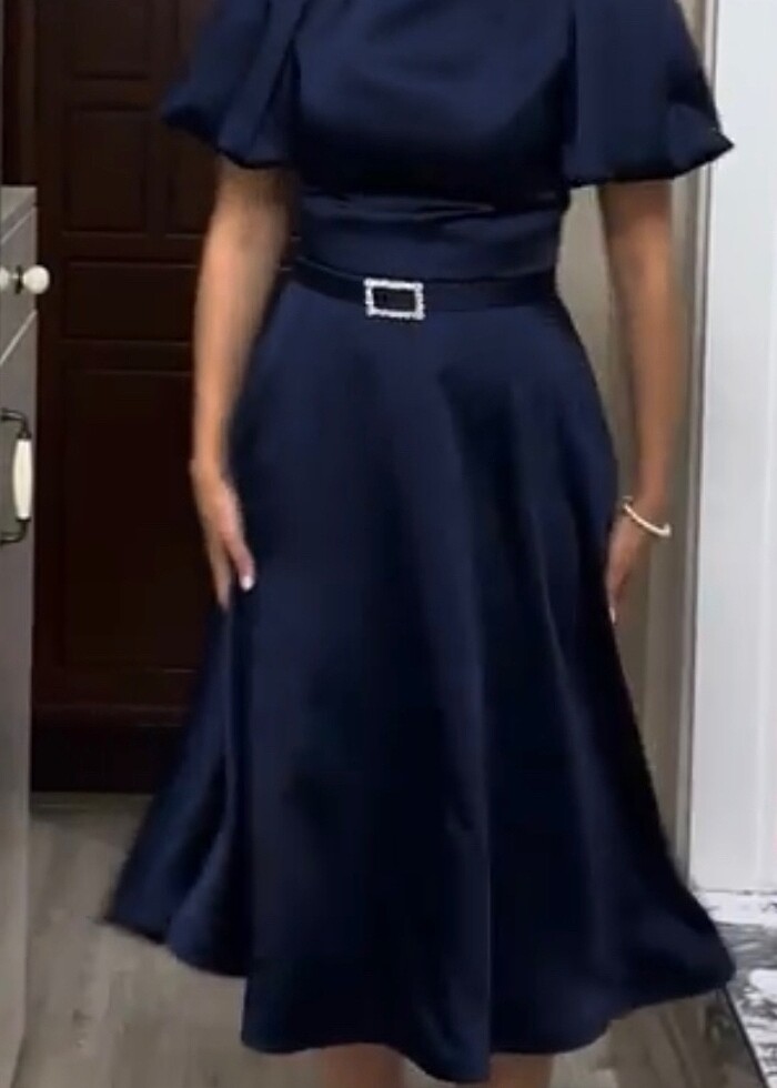 Parlak lacivert renkte midi elbise, tekne yaka ve çok hoş balon kol ve omuzlara sahip. Sentetik saten dokuma. 1 kez giyildi. Giyildikten sonra kılıfla saklandı. Elbise boyu 110 cm , M beden (38), elbisede herhangi bir terzi işlemi yok, taşlı kemeri de mevcut