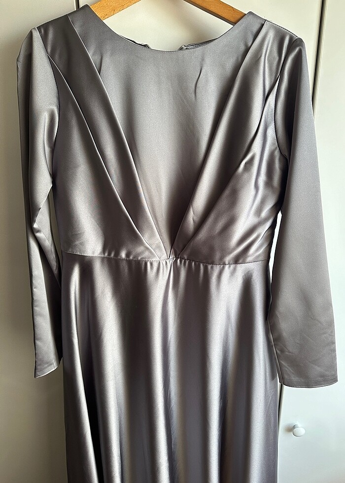 Gri saten uzun belden dikişli model eteği çan açılan yakadan bele doğru dikilmiş parça ile beli ince gösteren şık abiye elbise