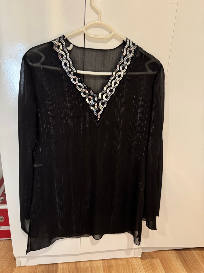Sadece 1 kere giyildi . Oldukça şık kadın abiye şifon . 36-40 beden arası , kol ve yaka detay pullu yepyeni bluz. . Hiç kusuru yok. Marka zara değil!!