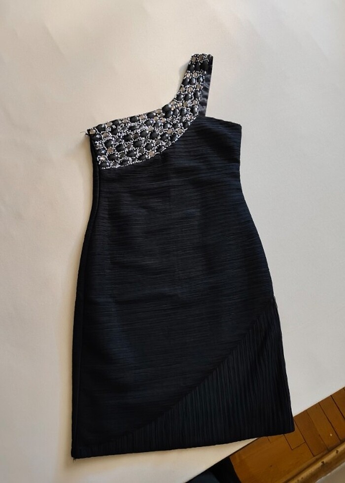 Siyah tek kol işlemeli vücudu saran diz üstü gece elbisesi Bir kez giyilmistir