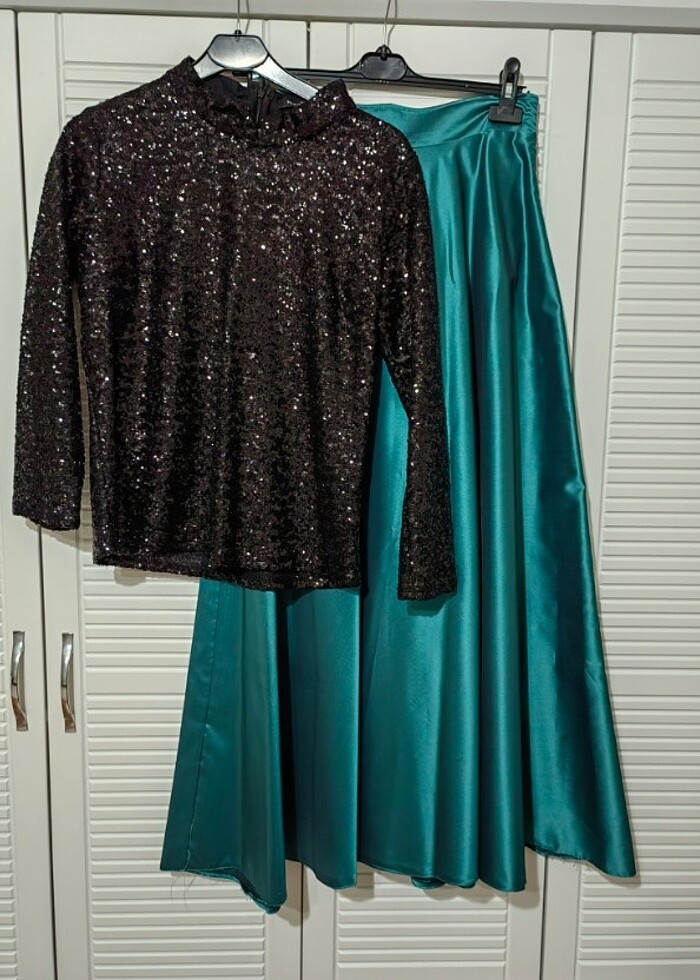 Etek Bel ölçüsü 37cm, boy 96cm. Pullu blüz göğüs ölçüsü 49cm, kol boyu (omuz hariç) 51cm. Etek tafta, üst pullu