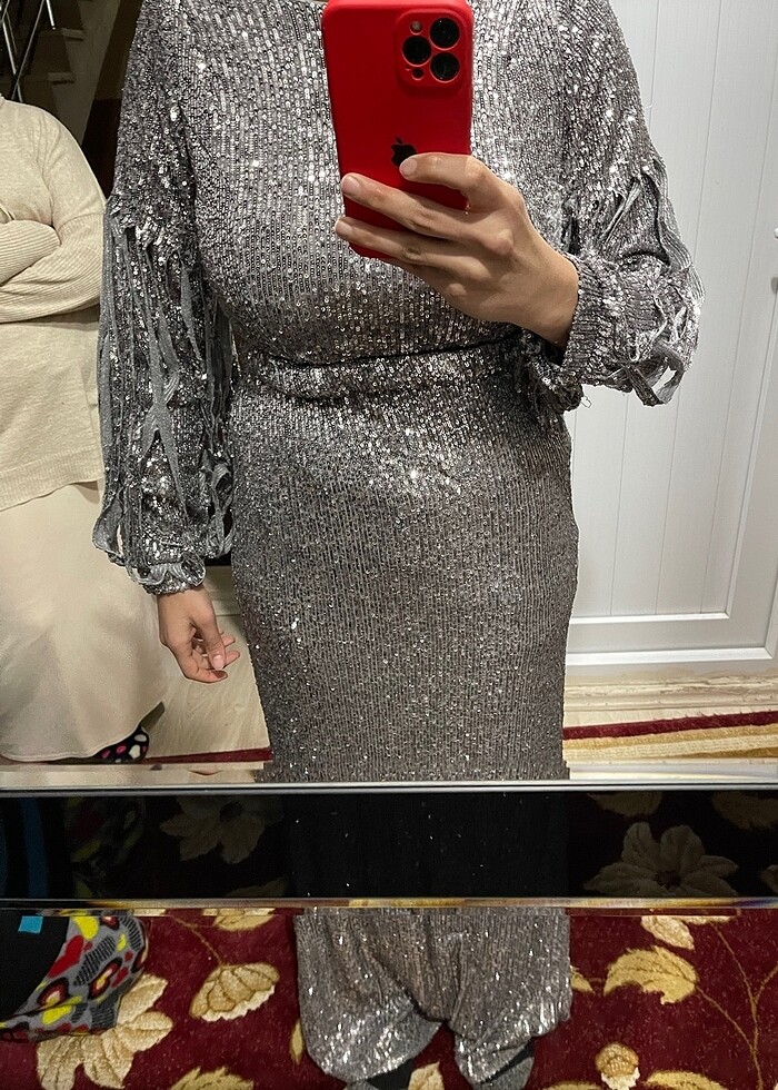Pul payet gümüş rengi 44-48 beden aralığında esnek kumaştır kollarındaki ip askıları tamamen çıkarılıpda kullanılabilir