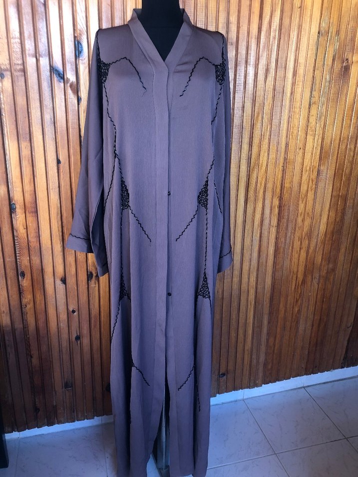 kahverengi uzun kollu V yaka önü ve kolları boncuk işlemeli önü çıtçıtlı 56 bedene uygun Birleşik Arap Emirliklerinden alınan abiye tesettür kap koltukaltı ölçüsü 56 cm boy 140 cm