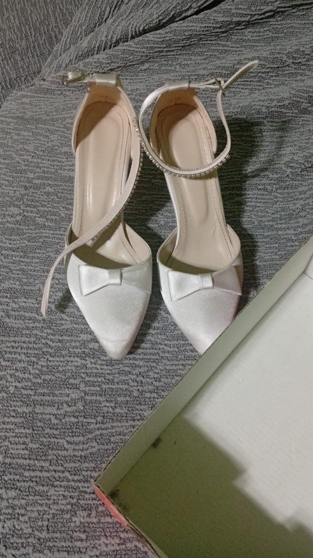 Beyaz stiletto topuklu, bilekten bağlamalı ve fiyonk detaylı sadece düğünde bir kez giydim